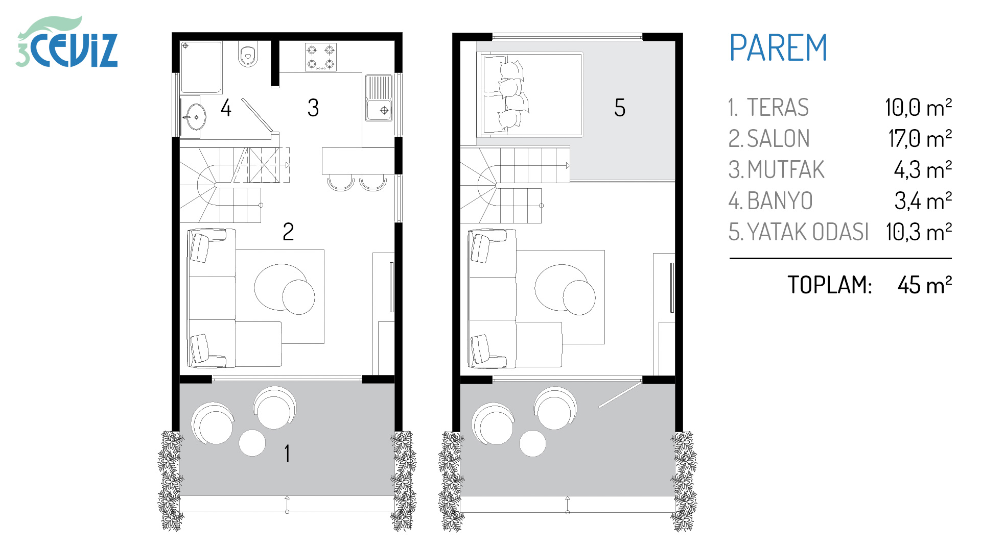 Tatlı bir çatı eğimine sahip olan, yaşam alanına ve tüm doğa manzarasına hakim asma katında yatak odası ile Parem, sade ve çağdaş bir tarza sahiptir. Giriş katında verandaya bakan yüksek cam sayesinde çok aydınlık bir yaşam alanı ile beraber 1 banyo, mutfak yer almaktadır. 2-3 kişilik aileler için “Gönüllü Sadelik” ve “Yeterli olan çoktur” anlayışı ile tasarlanarak sizlere var olmanın keyfini yaşatır.